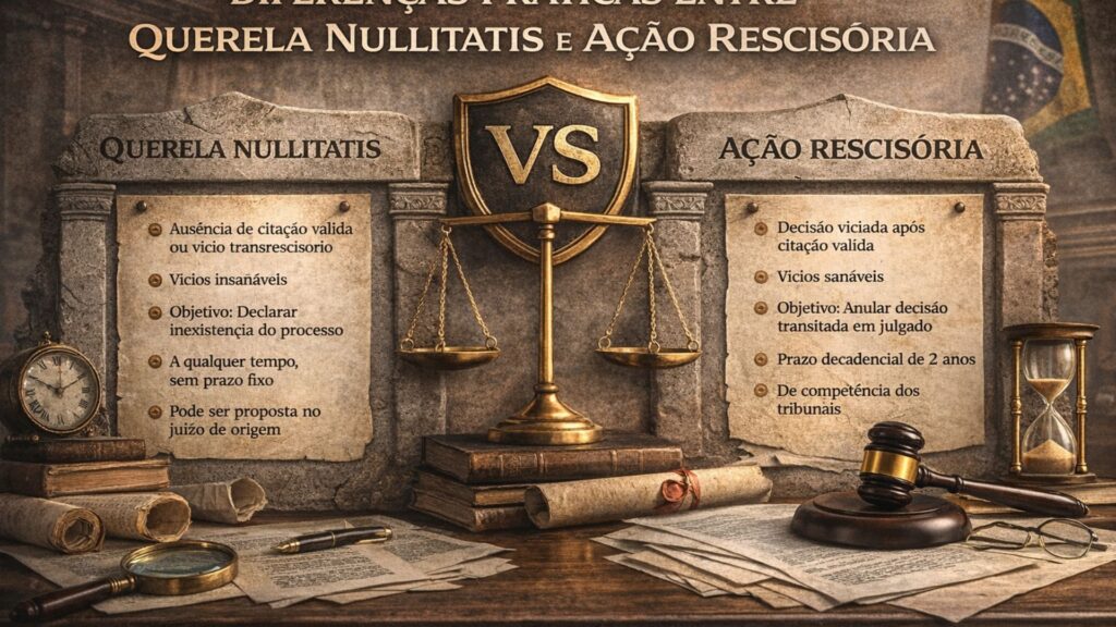 A querela nullitatis – em razão da natureza dos vícios transrescisórios, que acarretam a inexistência da anterior relação processual – não se sujeita a qualquer prazo decadencial ou prescricional, ao passo que o direito de pretender a rescisão do julgado decai, como visto anteriormente, em dois anos. Ademais, a querela nullitatis será proposta perante o juízo que proferiu a decisão impugnada, enquanto a rescisória é de competência dos tribunais. Apesar das diferenças, regras concernentes à legitimidade para o ajuizamento da rescisória, por exemplo, devem ser aplicadas, por analogia, à querela nullitatis.