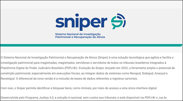 O SNIPER (Sistema Nacional de Investigação de Patrimônio e Recuperação de Ativos), desenvolvido pelo CNJ, é uma ferramenta de inteligência e investigação, diferentemente do SISBAJUD (sucessor do BACENJUD), que busca e bloqueia bens.